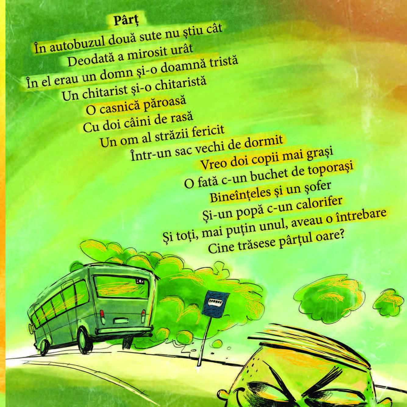 Cum ii faci pe copii sa le placa cititul? Simplu: scrii o carte care le place. Pui la un loc pisici, elefanti, un plasture, fetite si baieti, tantari, spanac, un rinocer, un caca, tatuaje, pe Mos Craciun, un Happy Meal, un capcaun, niste parinti si-un part, ii intorci cu susu-n jos si vezi ce iese. Daca mai adaugi si rime, ies niste poezii cu prostii pentru copii in care o pisica, in loc sa creasca, se face mai mica si devine parazit, elefantul se satura de leganat si goneste prin oras intr-o motocicleta cu atas, o guma se mesteca o saptamana, caruselul, in loc de cai si de sarete, e dotat cu baieti si fete, copiii cauta elixirul fericirii in loc sa-nvete tabla inmultirii, iar ursul e mancat de mure. Daca mai pui si multe idei ciudate, finaluri neasteptate si cele mai smechere ilustratii… E, uite asa, ii faci pe copii sa le placa cititul. PE DOS - poezii cu prostii pentru copii - Hai sa le citim, copii!