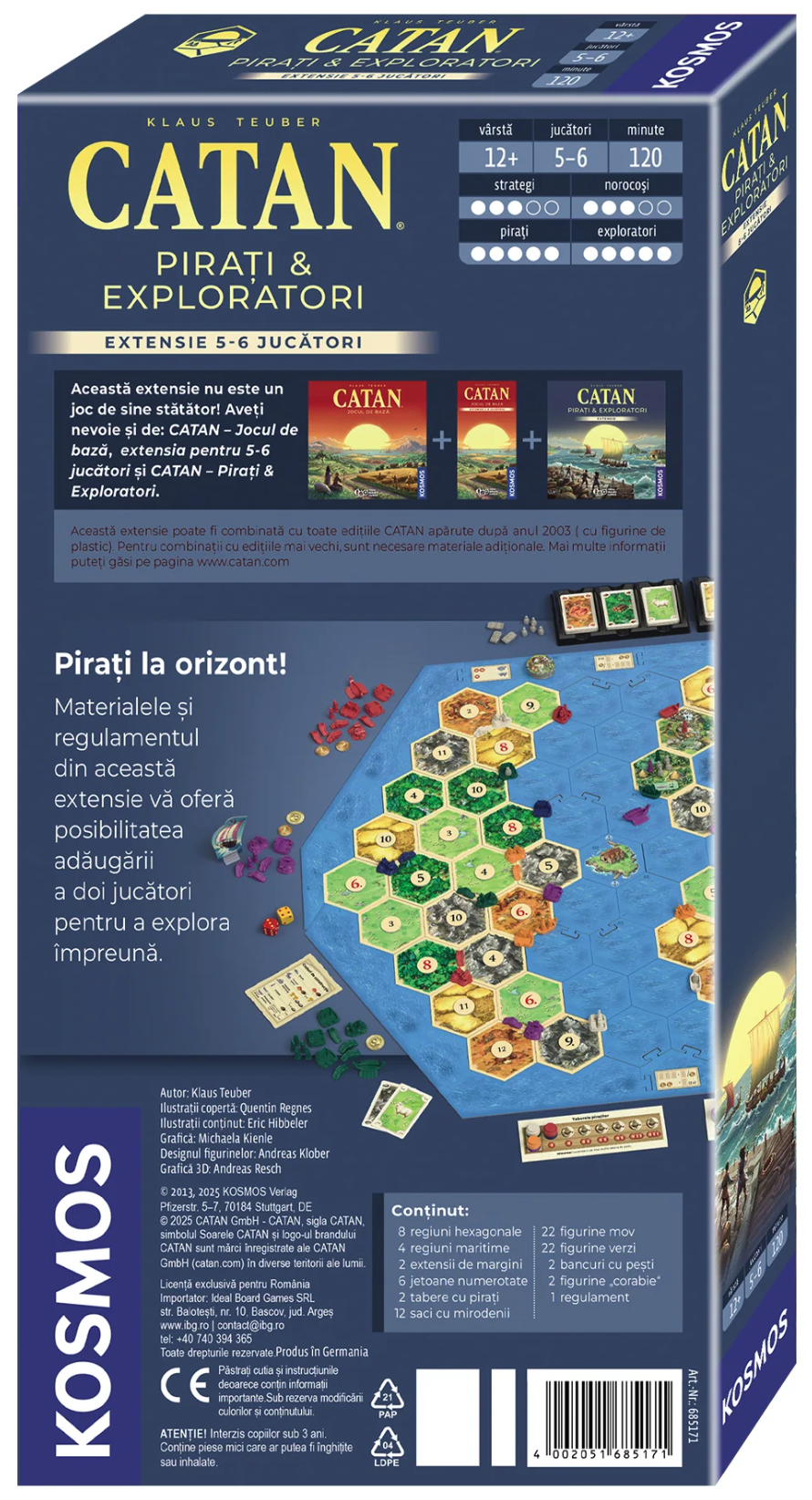 Extensie - Catan - Pirati & Exploratori (5-6 jucatori) (Editia 2025)Pirati la orizont!Materialele si regulamentul din aceasta extensie va ofera posibilitatea adaugarii a doi jucatori pentru a explora impreuna.Continut:8 regiuni hexagonale4 regiuni maritime2 extensii de margini6 jetoane numerotate2 tabere cu pirati12 saci cu mirodenii22 figurine mov22 figurine verzi2 bancuri cu pesti2 figurine „corabie“1 regulamentATENTIE! Aceasta extensie nu este un joc independent. Pentru a putea juca, aveti nevoie si de: CATAN - Jocul de bazaCATAN - Piratie & Exploratori (Extensie)Extensie 5/6 jucatori pentru CATAN - Jocul de baza