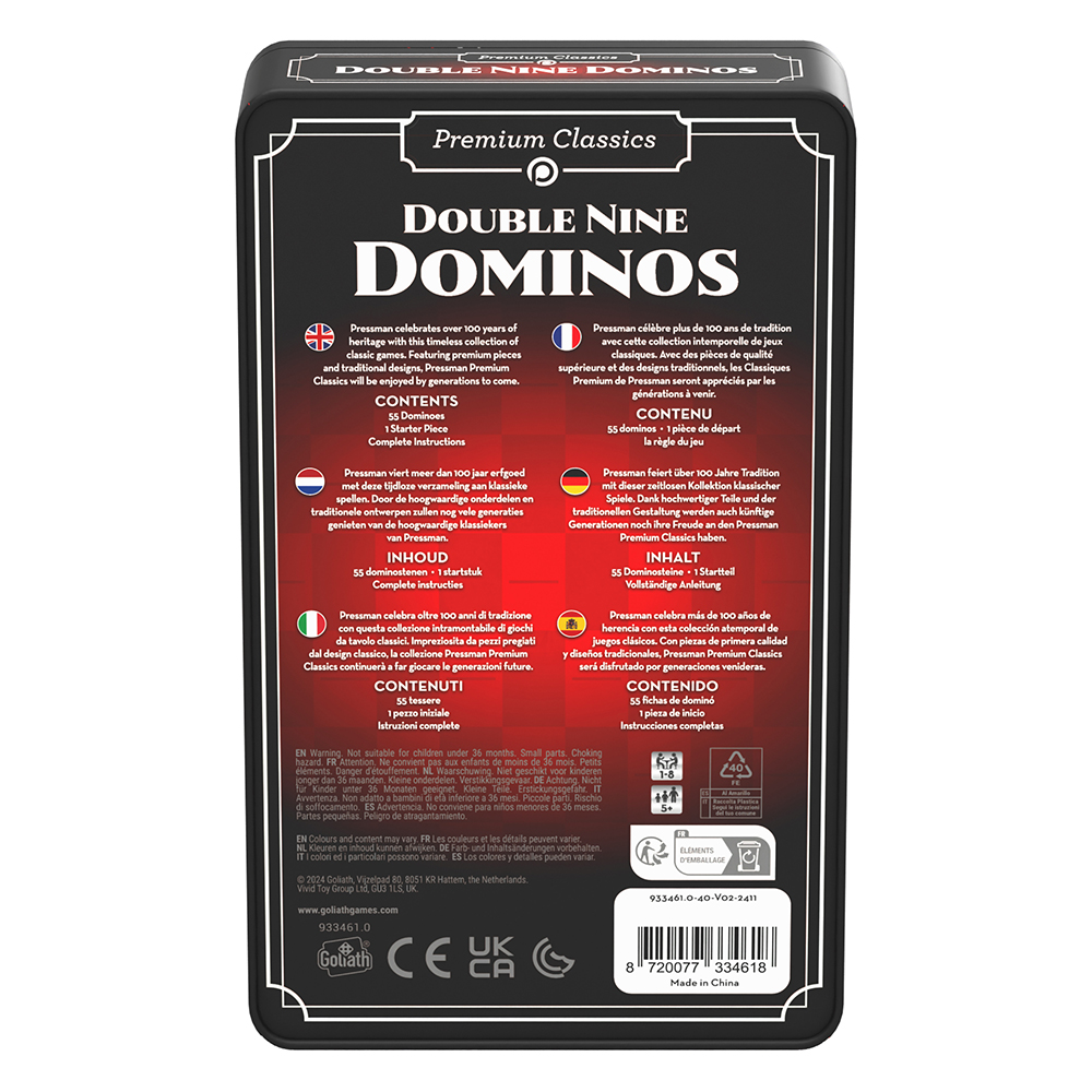 Ce contine jocul de societate Domino Clasic 9-9Cu 55 de piese de domino, numerotate de la 0 la 9, este perfect pentru diverse variante de joc in familie sau cu prietenii.Jocul este usor de depozitat si transportat datorita cutiei metalice durabile.Scopul jocului este simplu: numerele trebuie sa se potriveasca, iar tu trebuie sa iti plasezi toate piesele inaintea adversarilor. Despre colectia Premium Classics de la PressmanCu ocazia aniversarii de 100 de ani, Pressman, parte a grupului Goliath, a lansat o colectie speciala de jocuri clasice de societate, inclusiv aceasta editie Double 9 Dominoes. Datorita pieselor de inalta calitate, jucatorii se pot bucura din nou si din nou de acest joc clasic, captivant si atemporal!