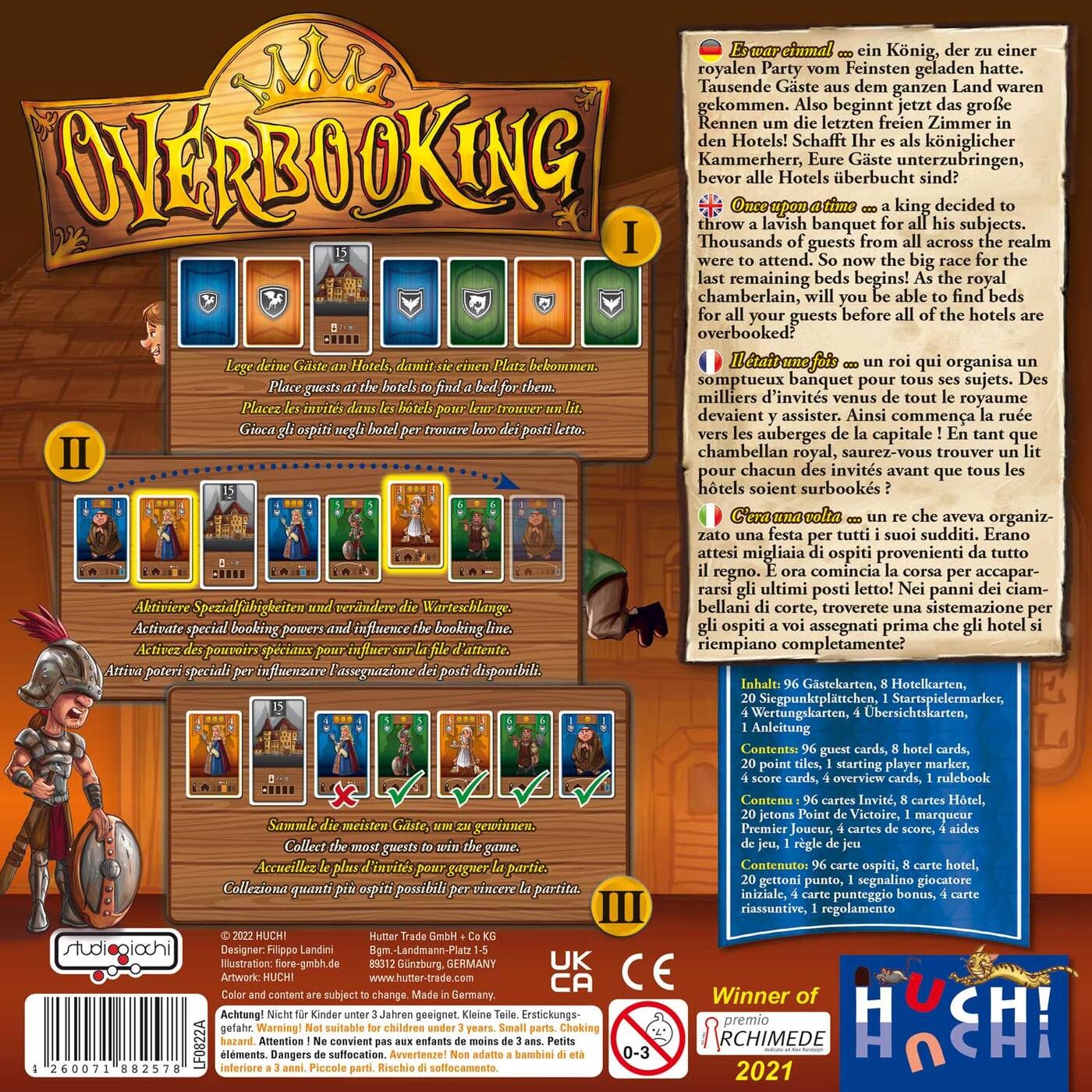 Joc de societate - OverbooKingA fost odata ca niciodata… un rege care voia sa organizeze o petrecere regala grandioasa pentru fiica sa. Mii de invitati din toate colturile tarii au fost chemati – negustori ambulanti, calugari, soldati si multi altii s-au indreptat spre capitala.Dar, vai! Pentru ca toti sperau la reduceri de ultim moment, nimeni nu si-a rezervat din timp o camera la hotel. Acum incepe marea cursa pentru ultimele locuri libere! Cine va reusi sa gaseasca un loc de dormit, cine va ramane afara si cine va reusi sa intre pe usa din spate cu un siretlic?In acest joc distractiv pentru intreaga familie, fiecare jucator incearca sa isi plaseze cartile cu oaspeti in putinele hoteluri disponibile si astfel sa adune puncte. Dar atentie: fiecare hotel poate gazdui doar un anumit numar de oaspeti. Va trebui sa intuiesti cati oaspeti vor trimite adversarii tai in cursa pentru camere si ce planuri viclean vor pune in aplicare ca sa te incurce!