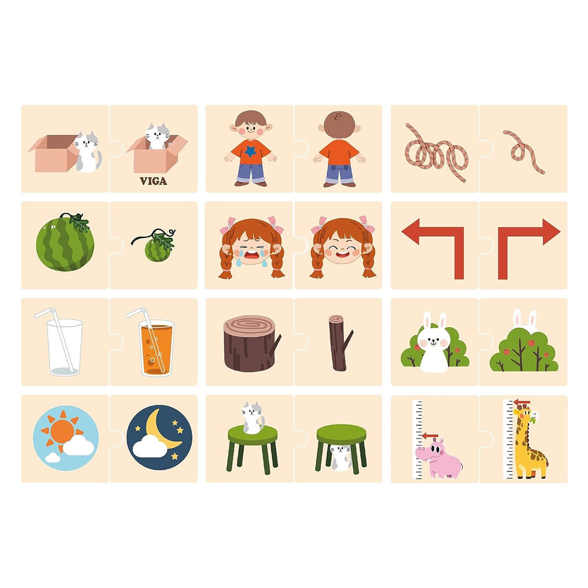 Observa placutele si potriveste corect imaginile cu contrarii!Puzzle de asociere din lemn, Opozitii de la Viga Toys este un joc educativ si distractiv, datorita caruia micutii vor invata prin joaca sa asocieze imaginile care arata notiuni opuse.Acest puzzle cu imagini colorate constituie o modalitate distractiva de a dezvolta vocabularul copiilor, in timp ce acestia potrivesc contrariile si invata despre diferente.Puzzle-ul din lemn cuprinde 12 perechi de imagini care evidentiaza opozitii: mic/mare, deasupra/dedesubt, scund/inalt, inainte/dupa, la stanga/la dreapta, plin/gol, zi/noapte, lung/scurt, fata/spate, gros/subtire, inauntru/afara, trista/vesela.Jocul include 24 de placute din lemn, imprimate cu imagini colorate, intr-o cutie de depozitare din carton cu inchidere magnetica.Copiii se vor bucura de sentimentul de implinire, atunci cand vor reusi sa potriveasca toate piesele jocului.Toate jucariile marca VIGA sunt fabricate din lemn de calitate cu vopsele si cerneluri non-toxice, supuse testelor de siguranta pentru a indeplini standardele internationale de siguranta EN71 si ASTM.